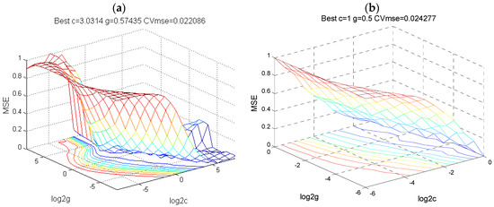 The RBF function was chosen as the kernel function of the regression prediction model. The presentation form of the RBF kernel function was simplified, easily realized, and theoretically analyzed, and also obeys a normal distribution. This function with a high generalization ability is capable of performing nonlinear mapping with respect to nonlinear data modelling [36]. The parameters of this function are fewer, which makes parameter optimization much easier.