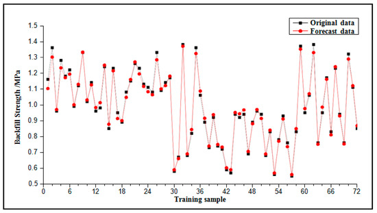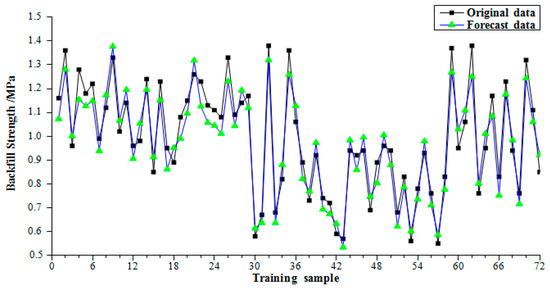 The final optimum parameter combination was obtained by testing it with a cross-validation comparative test. The well-trained SVM backfill strength design prediction model was obtained by performing grid training of the model using the optimum parameter combination. The result of the regression prediction processed by the SVM model is exhibited in Figure 4.