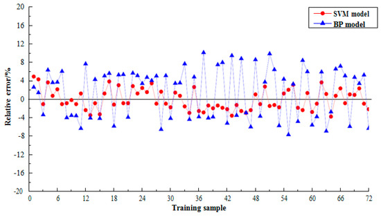 From the perspective of the maximum error of these two regression prediction models, the value for the SVM model was 4.97% and the BP neural network model’s was 10.17% [39,40]. Thus, the SVM model is more reliable. From the perspective of the average error, the value for the SVM model was 1.01% and the BP network model’s was 5.26%. From the perspective of minimum error, the SVM model demonstrated an error value of 0.12%, while the BP neural network model exhibited a significantly higher error value of 1.49% (shown in Figure 6 and Table 2). The results above indicate that data predicted by the SVM model were closer to the original data than those of the BP neural network model were, and that the former’s predictions were more accurate.