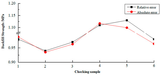 The model’s calibration adopted the built match model of backfill strength to predict six calibration samples, which were not part of the backfill strength match model training. These prediction results were compared with actual data from mines (shown in Figure 7). Errors in the calibration results are shown in Table 3.