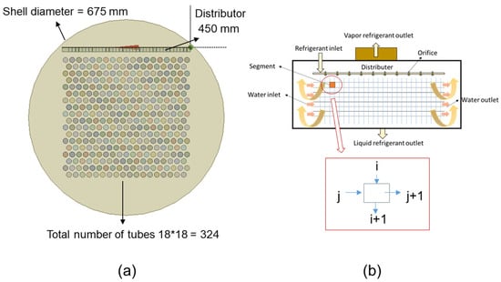 A segment-by-segment [22] numerical approach was implemented to model the thermal performance of the falling film evaporator. The computational domain was discretized both axially along the tube length and laterally across the tube columns, enabling a detailed two-dimensional analysis of the heat transfer process. In each control volume, the local heat transfer between the water flowing inside the tubes and the refrigerant falling on the shell side was evaluated. REFPROP was used throughout the simulation to obtain accurate thermophysical properties of both fluids at each local temperature and pressure condition. Figure 1a,b shows the preliminary design and modeling approach, respectively.