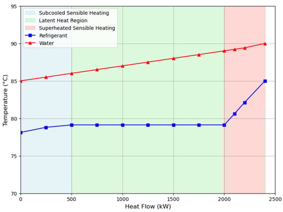 Temperature variation vs. heat flow in subcooled, two-phase, and superheated regions.