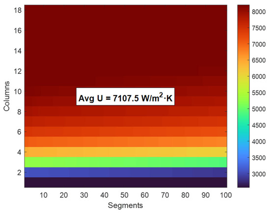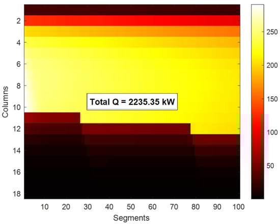 Figure 4 illustrates the distribution of the overall heat transfer coefficient (U) across the evaporator’s tube columns and axial segments. The x-axis represents the axial segments along the tube length, while the y-axis shows the tube columns in the crossflow direction. The color scale ranges from 3000 to 8000 W/m2·K. Higher U-values are observed in the upper columns (red zones), where the refrigerant is predominantly in the two-phase region, while lower U-values appear near the bottom (blue-green zones), corresponding to superheated regions. The average U across the entire domain is approximately 7107.5 W/m2·K, as displayed at the center. Figure 5 shows the segmental distribution of heat duty (Q) across the tube columns and axial segments in the evaporator. The x-axis represents the number of axial segments along the tube length, while the y-axis corresponds to the tube columns. The color scale indicates local heat duty, with higher heat transfer rates shown in yellow and lower values in dark red to black. The upper columns and early segments show higher heat duties, mainly due to greater temperature differences and dominant phase change. The total heat duty for the entire evaporator is approximately 2235.35 kW, as displayed in the center of the plot.