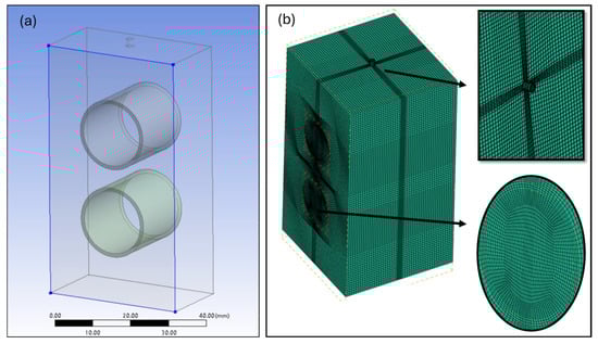 A 20 mm segment of the falling film evaporator was created in ANSYS (2024) Design Modeler as illustrated in Figure 6a to simulate fluid dynamics and heat transfer around the two copper tubes, each with an outer diameter of 19.05 mm. The computational domain, representing the evaporator’s shell, measures 48 mm in width and 84 mm in height; it is designed to capture a precise section of the shell flow. For effective refrigerant flow, the geometry includes an inlet with a diameter of 2 mm to allow the entry of R1336mzz(Z) refrigerant and an outlet with a diameter of 8 mm to maintain the desired flow rate and pressure drop. This configuration offered an accurate basis for CFD analysis by replicating the critical flow and heat transfer conditions within a falling film evaporator section.