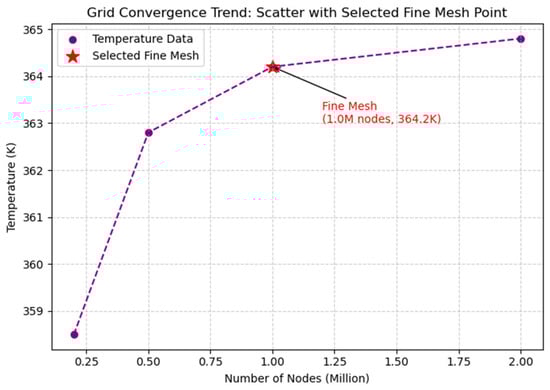 Mesh sensitivity analysis was carried out using four mesh densities, i.e., coarse, medium, fine, and very fine mesh sizes. Figure 7 illustrates the grid convergence trend for the simulated temperature as a function of mesh density. As the number of nodes increases, the predicted temperature approaches a stable value, indicating mesh independence. The fine mesh case (1.0 million nodes and 364.2 K) is highlighted, showing minimal change compared to the very fine mesh, with a difference of less than 0.4%. This demonstrates that the fine mesh provides an adequate balance between accuracy and computational cost. The scatter points and trend line clearly show the diminishing returns in accuracy with further mesh refinement.