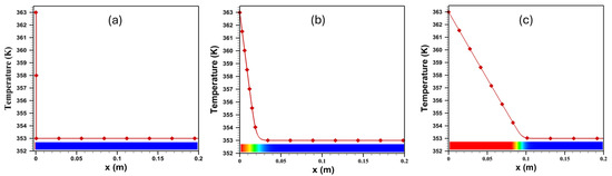 The simulation domain in Fluent was defined as a 2D rectangle with a height of 1 mm and a length of 0.2 m. A structured grid of 4000 cells was used along the horizontal (x) direction to ensure grid independence. No-slip adiabatic wall conditions were applied, and the left wall was treated as a constant temperature wall ().