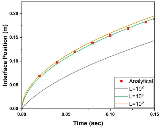 where is determined by solving the transcendental equation and is an error function (Equation (16)). Using the refrigerant properties described in Table 3, the analytical interface position was computed over a simulation time of 0.16 s. The time step was set to , consistent with the transient settings used in Fluent.
