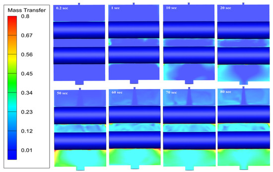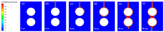 Figure 14 illustrates the temperature contours of the refrigerant R1336mzz(Z) as it formed a falling film over two horizontal tubes in a 3D domain, with the temperature evolution shown over time. The red-colored contours around the tubes represent the high temperature of the hot water flowing inside them. Before the refrigerant began flowing, the shell was filled with air at atmospheric temperature, which was lower than the temperature of the tubes. As a result, heat transfer occurred from the tubes to the air in the early stages, as seen in the first four frames.
