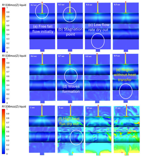 Figure 11 presents the 3D volume fraction of the liquid refrigerant R1336mzz(Z) as it fell from a small orifice and interacted with horizontal tubes. In the initial stage (a), the liquid underwent free fall before forming a stationary film at the stagnation point (b) on the tube surface. As gravity accelerated the film downward, it spread in both the axial and circumferential directions, with the contour colors shifting from red to light green, indicating the thinning of the film. At point (c), dry-out occurred due to low fluid flow, and as the droplets impacted the tube, the fluid dispersed in waves, as shown by point (d). Point (e) represents a region with no heat transfer, which is linked to dry-out regions caused by high heat flux, as seen in point (f).