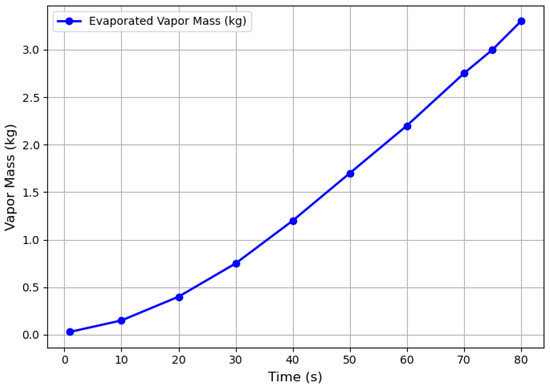 Figure 16 illustrates the time-dependent evolution of the evaporated vapor mass for the full evaporator over an 80-s period. This estimation was derived by scaling up the CFD results obtained from a small modeled segment of the evaporator. The x-axis shows time in seconds, while the y-axis represents the cumulative vapor mass generated in kilograms. Initially, the vapor mass remains close to zero, reflecting the start of the evaporation process. As time progresses, the vapor mass increases steadily, reaching approximately 3.3 kg by the end of the simulation. The continuous and smooth rise in the curve indicates stable heat transfer and consistent operating conditions within the evaporator. This result provides a useful estimation of the total vapor generation over time, offering insight into the evaporator’s transient performance under the given thermal and flow conditions.