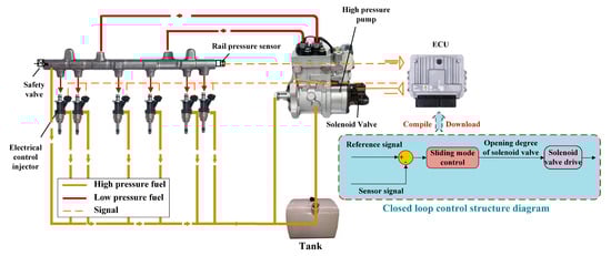 The HPCRS regulates fuel pressure by adjusting the inlet flow rate to the high-pressure pump. As shown in Figure 1, the HPCRS comprises fuel and electrical subsystems. The fuel subsystem includes the high-pressure pump, common rail, fuel tank, and electronically controlled injectors. The electrical subsystem consists of a pressure sensor, a solenoid valve, and an electronic control unit (ECU). The system operates as follows: fuel from the tank is supplied at low pressure to the high-pressure pump, which compresses it and transfers it to the common rail. The pressurized fuel is then distributed by the rail to individual injectors, which deliver it into the engine cylinders. In the closed-loop control system, the control algorithm is implemented and executed within the Engine Control Unit (ECU). By continuously comparing the reference pressure signal with the actual pressure feedback acquired from the pressure sensor, the ECU dynamically adjusts the fuel flow rate entering the high-pressure pump in real-time. This regulation of fuel flow is accomplished through precise modulation of the solenoid valve opening by the driver module, ultimately ensuring accurate control of the common rail pressure.