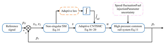 where d represents the lumped disturbance, which encapsulates uncertainties in fuel physical properties as well as external perturbations caused by fluctuations in rotational speed, fuel pumping, and injection; the known functions and describe the system coefficients. This paper focuses on the case of ξ = 1 and proposes a novel adaptive CNTSMC to achieve precise tracking of the reference rail pressure.