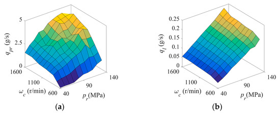 From Equation (17), the equivalent control component ueq depends on the fuel leakage rate ql and the discharge flow qpr. These two variables are not directly measurable in practical systems and are influenced by engine rotational speed ωc and the rail pressure pr. In this study, we constructed a feedforward mapping for ql and qpr through experimental calibration. The resulting MAP data is illustrated in Figure 3.