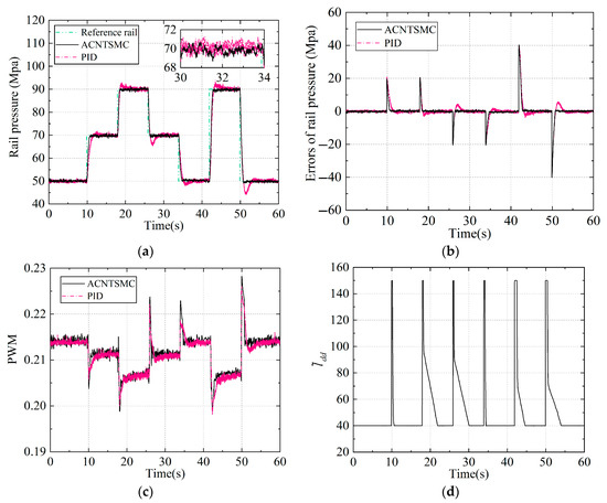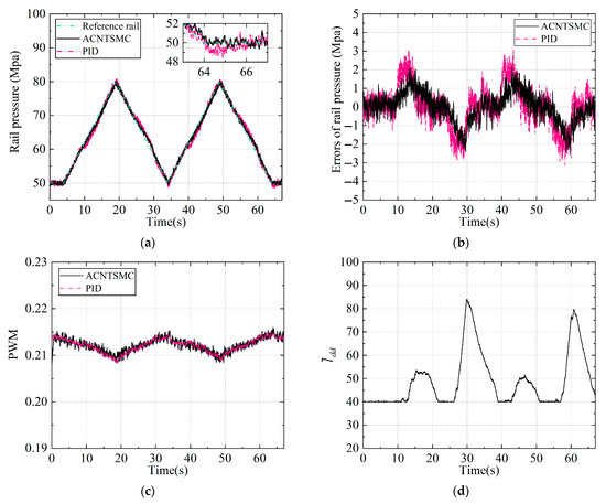 This mechanism enables the ACNTSMC to significantly improve control system energy efficiency and stability while maintaining high performance. Under step rail pressure excitations, the ACNTSMC controller demonstrates superior performance compared to conventional PID in response speed, steady-state accuracy, input smoothness, and disturbance rejection capability, validating its engineering adaptability and robustness in HPCRS facing complex dynamic variations.