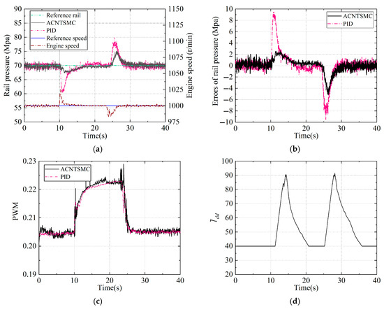 Experimental comparison in Case 2: (a) reference signal and rail pressure; (b) errors of rail pressure; (c) control signal PWM; (d) adaptive parameter .