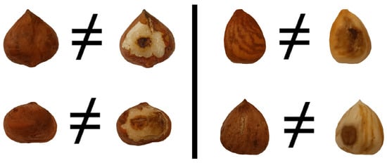 Hazelnut quality is primarily determined by kernel percentage calculation (Equation (1)), typically performed during post-harvest sales in hazelnut purchasing centers [13]. In these centers, hazelnut kernel percentage calculation is performed mainly using traditional techniques, relying heavily on the expertise of hazelnut specialists [14]. However, since this approach depends on human judgment, it may result in subjective errors and complicate the identification of defects that are not easily seen by the naked eye (Figure 1). These circumstances adversely impact critical aspects such as storage duration, industrial applications, and equitable pricing of hazelnuts.