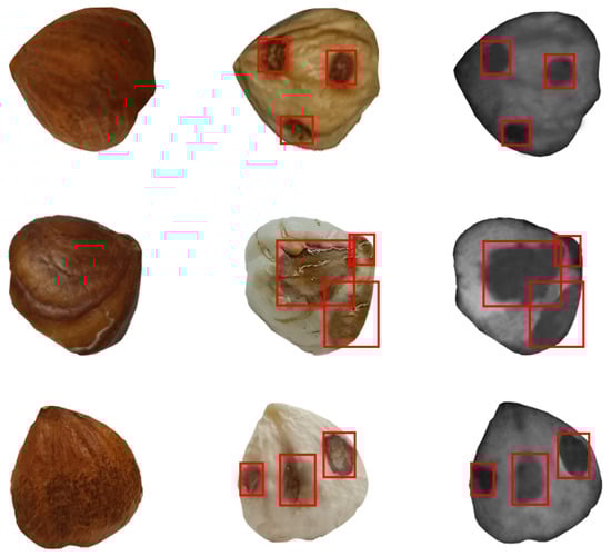 Unprocessed hazelnut kernel/processed hazelnut kernel/X-ray image of hazelnut. Red squares represent defective areas in the hazelnut kernels.