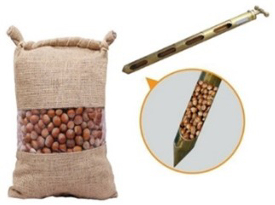 As illustrated in Figure 3, the hazelnut quality assessment system comprises four distinct stages. Initially, in the random hazelnut selection process, samples are collected from the hazelnuts for which the kernel percentage is to be evaluated. The apparatus shown in Figure 4 is a manually operated tool used to obtain homogeneous samples from hazelnuts stored in bulk or bags. Thanks to the holes on its surface, it allows product collection from different points, ensuring a reliable sample for analysis. The apparatus shown in Figure 4 is used to select hazelnut samples, which are then placed in a container for processing. The gathered hazelnuts are mixed to achieve a uniform distribution. Subsequently, a random sample of 250 g is chosen for quality evaluation and undergoes the kernel percentage calculation process. In the hazelnut cracking step, the randomly selected hazelnuts are processed on a specialized hazelnut cracking machine, which results in shells and kernels. During this phase, kernels and shells are separated, and kernels are directed to the X-ray imaging stage to identify healthy hazelnuts.
