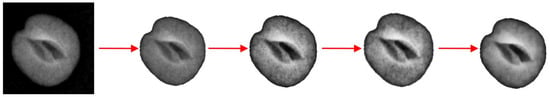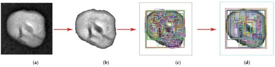 In order to ignore the background outside the hazelnut, the Otsu filter was used on all hazelnut images, and areas outside the hazelnut were converted to white. The following filters were sequentially applied to the images in the dataset to facilitate learning: Contrast Limited Adaptive Histogram Equalization (CLAHE), Gaussian Blur, and Anisotropic Diffusion (Figure 6). These filters highlight defective regions and provide more accurate and effective results in bounding box detection. Moreover, the transformation of the outside regions to white significantly reduces the likelihood of incorrectly predicting boundary boxes, thus improving the performance of the utilized deep learning model. In this way, the developed Neighborhood Relationship Algorithm helps to detect bounding boxes more effectively. Thus, the hazelnut image to be used is prepared for the deep learning process.