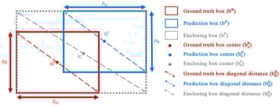 Bounding box regressions are calculated by object detectors between the ground-truth () and target () boxes. Figure 7 illustrates the , , and (enclosing box) boxes, where , , and denote the ground-truth box center, the prediction box center, and the enclosing box center, respectively. Bounding boxes are rectangular and are mathematically expressed as (Equation (4)). In this expression, x and y are the coordinates of the box, and w and h are the width and height.