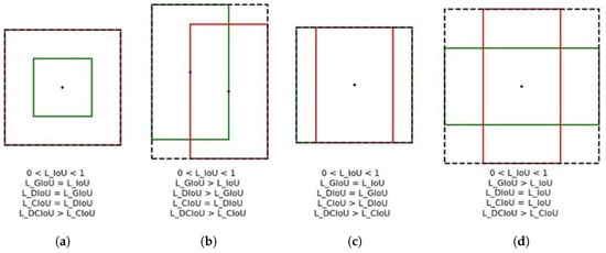 - Rezatofighi, H.; Tsoi, N.; Gwak, J.; Sadeghian, A.; Reid, I.; Savarese, S. Generalized intersection over union: A metric and a loss for bounding box regression. In Proceedings of the IEEE/CVF Conference on Computer Vision and Pattern Recognition, Long Beach, CA, USA, 15–20 June 2019; pp. 658–666. [Google Scholar]