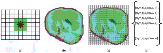 The Neighborhood Relationship Algorithm initially transforms the images obtained from the preprocessing phase into two-dimensional (2D) matrices in tensor format, assigning pixel values to these matrices (Figure 9b). A primary objective of the preprocessing phase is to foster a more balanced clustering procedure by achieving homogeneity in the image histogram. This approach helps to produce more reliable clustering outcomes by mitigating intensity discrepancies. Clustering is executed based on the pixel intensities using the K-Means algorithm on the matrix where the pixel values have been assigned. Following the clustering process, each element of the matrix is assigned the cluster values to which it belongs. Subsequently, starting from the first element of the matrix that has been assigned cluster values, its neighbors are identified, as illustrated in Figure 9a.