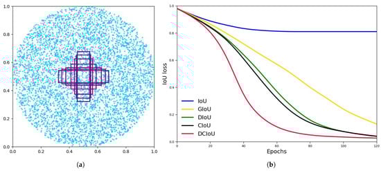 In order to assess the simulation experiment proposed by Zheng et al. [68], the performances of the loss functions IoU, GIoU, DIoU, CIoU and DCIoU were compared. For this experiment, real bounding boxes were generated, centered at (0.5, 0.5) with an area of 1/32. These boxes were created with seven distinct aspect ratios: 1:4, 1:3, 1:2, 1:1, 2:1, 3:1, and 4:1. Subsequently, 5000 anchor points were evenly distributed in a circular region centered at (0.5, 0.5) with a radius of 0.5 units. At each anchor point, 49 anchor boxes were placed, using seven different scales (1/32, 1/24, 3/64, 1/16, 1/12, 3/32, and 1/8) alongside the seven aspect ratios mentioned above. Consequently, a total of 1715000 regression samples were generated (7 × 7 × 7 × 5000), with each anchor box matched to the corresponding ground-truth bounding box (Figure 11a). In the experiment, the Adam optimization method with a learning rate of 0.01 was used, and the model was trained for 120 epochs. The experimental results are shown in Figure 11b. It is observed that the IoU loss experiences the slowest decline and optimization halts after a certain point. Although the GIoU loss demonstrates an improved convergence compared to the IoU, it remains at high values. DIoU and CIoU losses show a faster decrease trend and perform better compared to IoU and GIoU. The DCIoU function shows the fastest convergence, achieving lower loss values considerably earlier than the other methods. These findings demonstrate that DCIoU stands out as the most effective loss function, especially in applications where bounding box regression is critical, such as object detection. Previous IoU-based methods, including IoU, GIoU, DIoU, and CIoU, generally calculate regression losses based on overlap ratios or dimension differences between bounding boxes. However, as shown in Figure 8, these methods may fail to overcome regression errors under various overlap scenarios, leading to stagnation or slow convergence during model training. To overcome these limitations, the proposed DCIoU incorporates not only the distance between the centers of the boxes but also the minimum enclosing area and its centroid in the function computation. Consequently, DCIoU provides a more stable learning process and achieves higher accuracy in object detection.