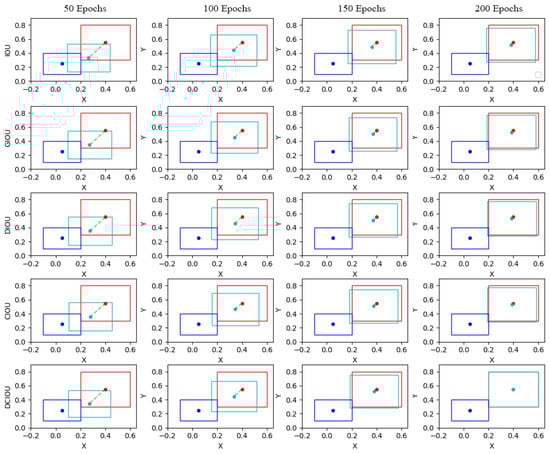 The results presented in Figure 12 show that the predicted boxes gradually converge to the target boxes as the number of iterations of the IoU, GIoU, DIoU, CIoU, and DCIoU metrics increases. Each metric was observed to have different convergence dynamics and the DCIoU metric provided higher accuracy of positioning compared to the other metrics at the end of 200 iterations. This observation indicates that DCIoU facilitates a more efficient convergence during the optimization process and can be regarded as a more reliable regression metric in applications such as object detection.