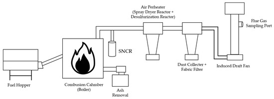 Combustion tests were conducted to assess the emission characteristics of the air pollutants generated during the combustion of the cattle manure-based solid fuel and evaluate their compliance with the relevant legal standards. A dedicated solid fuel boiler with a thermal capacity of 2.51 × 106 kJ/h and maximum processing capacity of 150 kg/h, located at the same facility, was used. This was equipped with a centrifugal dust collector, fabric filter, and selective noncatalytic reduction (SNCR) system, allowing for the effective reduction of major air pollutants. The tests were performed by a certified emissions measurement agency in accordance with the standards outlined in Annex 8 of the Enforcement Rules of the Clean Air Conservation Act. The emission limits for biomass and wood pellet boilers were applied. The cattle manure-based solid fuel was continuously fed into the boiler at a rate of 150 kg/h for 8 h. After combustion, the residues were collected separately and used for further analysis.