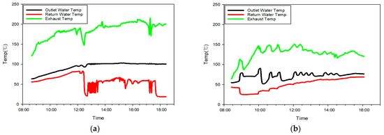 To quantitatively compare air pollutant emissions under different combustion conditions, variations in the combustion chamber temperature, exhaust gas temperature, and return water temperature were analyzed over time during the combustion tests. Figure 2a shows the temperature profile of the first test, in which the hot water tank temperature increased rapidly, making it difficult to control the combustion chamber temperature. This likely led to incomplete combustion and a corresponding spike in CO emissions. Figure 2b illustrates the second test, during which the hot water circulation system operated stably and maintained a consistent internal combustion temperature. This stable condition contributed to significant reductions in key air pollutants such as CO and NOx