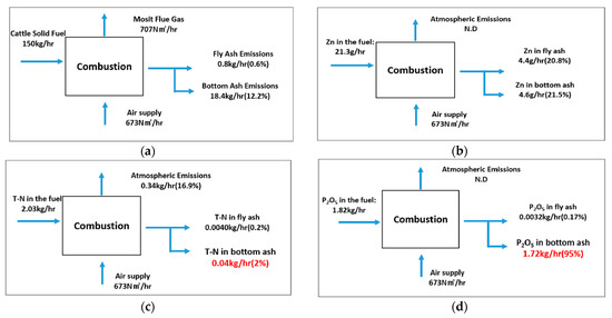 Mass flow diagrams of the major components in the cattle manure-based solid fuel: (a) Cattle Solid Fuel, (b) Zn, (c) total N, and (d) P2O5.
