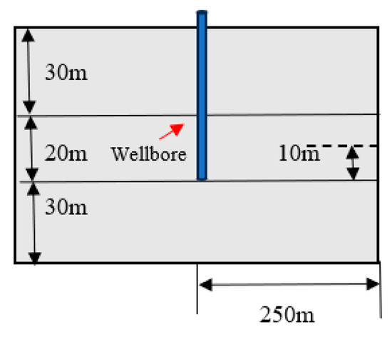 According to the geological data and logging results in this area, the hydrate layer is located in seawater with a depth of 1000–1700 m, at a burial depth of 150–300 m, and with a thickness of 10–43 m. The model in this paper is established based on the public geological data of the SH7 site in the Shenhu sea area of the South China Sea. In this area, the seawater depth of the stratum is 1108 m, and the hydrate reservoir is located 155 m to 177 m below the seabed, i.e., the thickness of the overlying stratum is 155 m, and the thickness of the hydrate reservoir is 22 m. The model size is 500 m × 500 m × 80 m, the thickness of the upper cover layer is 30 m, and the thickness of the hydrate layer is 20 m; the thickness of the lower cover layer is 30 m; the diameter of the production well is 0.1 m, as shown in Figure 1. The basic parameters of geological model are shown in Table 1.