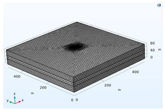 In terms of calculation accuracy, during depressurization exploitation, the pressure, porosity, and hydrate saturation in the wellbore surrounding area (within 10 m of the wellbore) change drastically. Using a fine mesh (0.1 m) here can accurately capture the steep gradients of physical parameters, ensuring precise simulation of fluid seepage and hydrate dissociation dynamics. In terms of computational efficiency, if a uniformly fine mesh (0.1 m) was adopted, the number of elements would exceed 108, resulting in an excessively long iterative solution time that exceeds the actual computational capacity. After using a gradient mesh (from 0.1 m near the wellbore to 10 m far from the wellbore), the total number of elements reduced to approximately 5 × 106, which significantly improved efficiency while ensuring calculation accuracy in key areas. “Size adjustment” was applied to the hydrate layer and wellbore area, with a minimum element size of 0.1 m and a maximum element size of 10 m. The near-wellbore area was encrypted to improve the simulation accuracy, as shown in Figure 2.