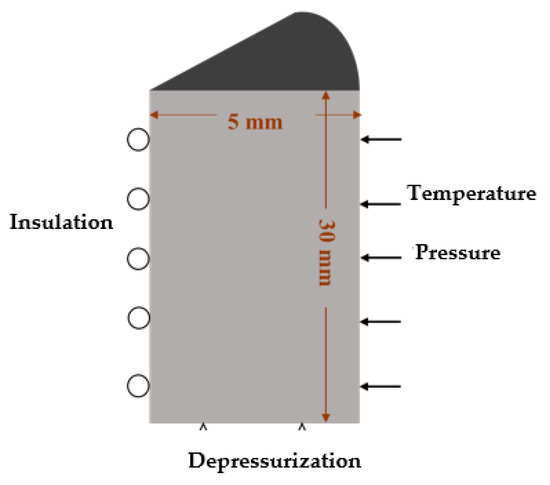 The hydrate phase change model was verified by comparing it with the results of Case 3 in Benchmark Problem 1 of IGHCCS2. Figure 4 shows the initial and boundary conditions of the 2D axisymmetric model in Case 3. The model has a radius of 5 mm and a height of 30 mm. The axis of symmetry is set with roller support, impermeable, and adiabatic conditions, meaning that only vertical deformation can occur on this axis, with no fluid flow or heat transfer. Both the top boundary and the cylindrical boundary of the model have constant stress and temperature conditions and are impermeable boundaries. The bottom boundary of the model can only move vertically and has a constant temperature boundary condition. The pressure at the bottom boundary decreases linearly from 12 MPa to 4 MPa within 10 s and remains constant thereafter, with a simulation time of 10,000 s. The initial pore pressure and initial external stress of the model are 12 MPa and 13 MPa, respectively. Both the initial water saturation and initial hydrate saturation are 0.5. The initial temperature and constant temperature boundary condition are 10 °C, the model porosity is 0.4, and the permeability is 10−16 m2.
