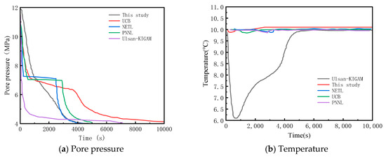 Figure 5 shows a comparison between the numerical calculation results of this study and those from other models, revealing that all results are generally consistent and exhibit the same trend of change. Figure 5a presents the curve of pore pressure versus time. It can be observed that the differences in the rate of pore pressure decline are relatively complex, which is attributed to the variations in hydrate phase change models and permeability models adopted by different solvers. Figure 5b displays the numerical simulation results of temperature changes over time, indicating that the results of this model are basically consistent with those from other simulators. Before the onset of hydrate dissociation, the temperature remains constant; then, it decreases slightly due to hydrate dissociation, and finally recovers through heat conduction from the constant-temperature boundary.