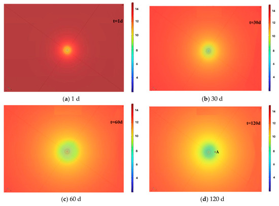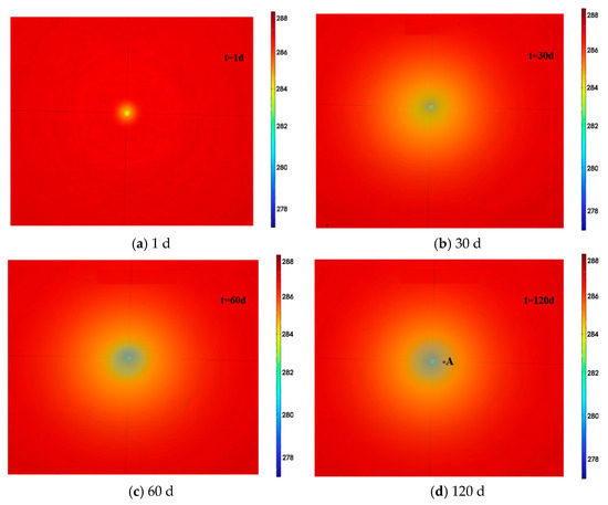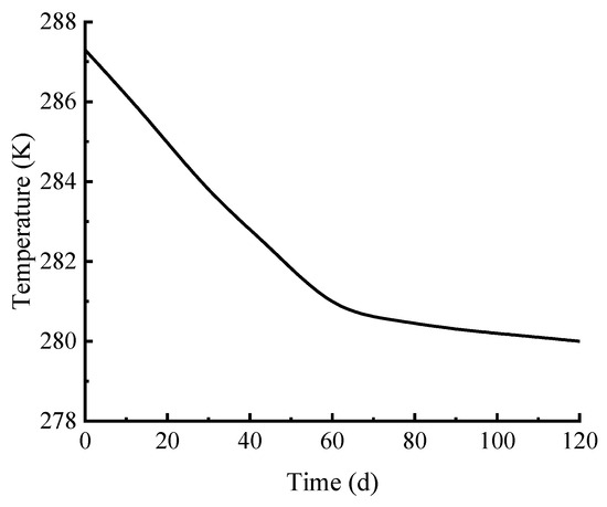Figure 11 displays the temperature–time curve at Point A, 10 m from the vertical wellbore. As shown in Figure 11, the temperature at Point A within 0–30 days decreases significantly from the initial 287.3 K to 283.8 K, a drop of 3.5 K (1.22% reduction). This is attributed to the rapid pressure decrease triggering fast hydrate dissociation, with intense endothermic heat absorption causing the sharp temperature decline. From 30 to 60 days, the temperature continues to drop but at a slower rate, reaching 281 K (a 1 K reduction). This occurs because the hydrate dissociation rate slows down, leading to less dissociation and limited heat absorption. Between 60 and 120 days, the temperature stabilizes at approximately 280 K (a 1 K reduction), indicating that the reservoir’s thermal equilibrium has adapted to the production activities, and the temperature tends to remain constant.