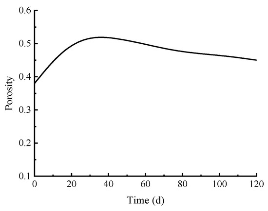 Figure 12 illustrates the curve of porosity at Point A, 10 m away from the vertical wellbore, changing with time. As shown in Figure 12, during the depressurization production of vertical wells, the porosity at Point A within 0–30 days increases from 0.38 to 0.52, with an increase rate of 36.84%. This is because after depressurization production, hydrates dissociate rapidly, and the hydrates originally occupying the pore space are converted into two phases: gas and liquid. The release of pores leads to the increase in porosity. From 30 to 60 days, the porosity starts to slowly decrease to 0.48, with a decrease rate of 7.69%. This is due to the fact that the dissociation rate of hydrates slows down, and fine-grained materials in the reservoir migrate and redistribute with fluid flow, blocking part of the pores and causing the porosity to decrease. From 60 to 120 days, the porosity slowly decreases to 0.45, with a decrease rate of 6.25%. At this time, the reservoir structure tended to be stable, the dissociation of hydrates was basically completed, and the porosity decreased under the influence of fluid migration and slight compaction.