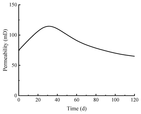 Figure 13 shows the curve of permeability at Point A, 10 m from the vertical wellbore, versus time. As shown in Figure 13, the permeability variation at 10 m around the wellbore exhibits a three-stage characteristic of “first increasing, then decreasing, and finally stabilizing”, which is the result of the dynamic interaction of multiple mechanisms. Within 0–30 days, the permeability rapidly increases from 75 mD to 100 mD, mainly due to the rapid dissociation of hydrates (with saturation decreasing from 0.4 to 0.2) that releases pore space. Additionally, the sudden drop in reservoir pressure (from 13.83 MPa to 9.8 MPa) causes slight expansion, widening the seepage channels. Within 30–60 days, the permeability first rises to a peak of 120 mD and then drops back to 90 mD. In the early stage, the continuous dissociation of residual hydrates and the slow pressure drop still supplement pores; in the later stage, however, fine particles migrate with water flow and block pore throats, and the slowed dissociation rate leads to insufficient new pores, resulting in the decline in permeability. Within 60–120 days, the permeability stabilizes at 60 × 10−3 μm2. Since hydrate dissociation basically stops, the migration of fine particles weakens, but the low-permeability zones formed by previous blockages remain fixed. Coupled with slight compaction of the reservoir, a stable low-permeability state is finally formed. This process reflects the dynamic competition between mechanisms such as “hydrate dissociation enhancing permeability”, “pressure-driven pore expansion”, “fine particle migration blocking permeability”, and “reservoir compaction reducing permeability” in unconsolidated argillaceous silt reservoirs during depressurization exploitation.