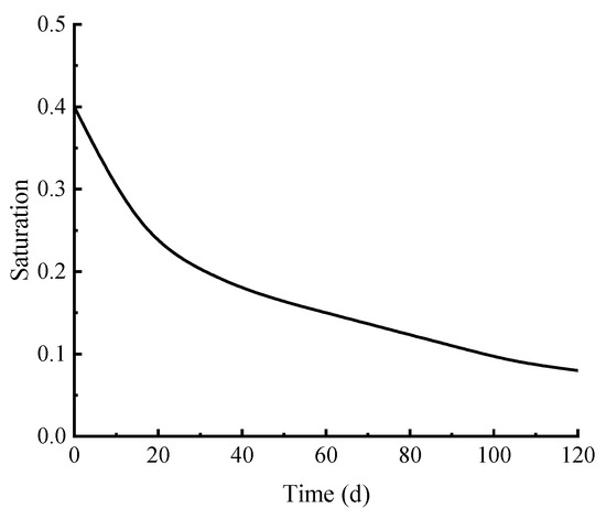 Figure 14 shows the curve of hydrate saturation at Point A, 10 m from the vertical wellbore, versus time. As indicated in Figure 14, the hydrate saturation at Point A continuously decreases within 0–30 days, rapidly dropping from an initial value of approximately 0.4 to 0.2, representing a 50% decrease. This is because during the initial stage of depressurization production in vertical wells, the pressure near the wellbore decreases rapidly, disrupting the phase equilibrium conditions of hydrates and causing the hydrates around the wellbore to dissociate rapidly. From 30 to 60 days, the hydrate saturation decreases from 0.2 to 0.15 (a 25% decrease), with a significantly smaller decline compared to the initial production stage. Although the hydrate dissociation zone continues to expand, the slowing down of formation pressure decline and the inhibitory effect of temperature decrease caused by the endothermic dissociation process on reaction kinetics lead to a significant reduction in the saturation decline rate. Between 60 and 120 days, the hydrate saturation continues to drop below 0.1. As the production process continues, when the formation pressure gradually approaches the equilibrium pressure, the driving force for hydrate dissociation continuously decays, causing the saturation decline rate to further slow down and finally reach a dynamic equilibrium state.