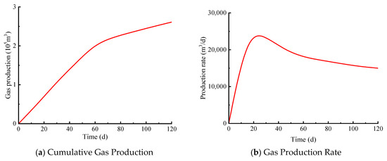 Figure 15 shows that during the depressurization exploitation with a vertical well, the gas production rate presents a trend of “first increasing and then decreasing”, while the cumulative gas production increases continuously. This dynamic change is closely related to the multi-field coupling effect of the reservoir. At 0–30 days (gas production rate peak stage), the gas production rate rapidly rises from the initial value to 25,000 m3/d, mainly benefiting from the rapid dissociation of hydrates in the near-well region. In this stage, the sudden drop in pressure around the wellbore (from 13.83 MPa to 9.8 MPa) breaks the phase equilibrium; meanwhile, the porosity (from 0.41 to 0.52) and permeability (from 75 × 10−3 μm2 to 100 × 10−3 μm2) increase significantly, providing efficient channels for gas migration. However, the peak duration is short (about 10–15 days), limited by two factors: first, the rapid temperature drop in the near-well region (from 287.3 K to 283.8 K) caused by hydrate dissociation (endothermic) inhibits the dissociation kinetics; second, the produced water gradually occupies the pore space, reducing the gas phase relative permeability. At 30–60 days (decline stage), the gas production rate drops to 20,000 m 3/d, and the cumulative gas production increases to 2 × 106 m3. At this stage, the pressure drop rate slows down (from 9.8 MPa to 8.6 MPa), and the permeability falls back to 90 × 10−3 μm2 after reaching the peak (120 × 10−3 μm2) due to fine particle migration. These two factors lead to a synchronous decrease in the dissociation and gas production rates. It is worth noting that the cumulative gas production still keeps growing, indicating that the hydrate dissociation zone in the far-well region continues to expand. At 60–120 days (stable decline stage), the gas production rate drops to 15,000 m3/d, and the cumulative gas production reaches 2.2 × 106 m3. At this time, the reservoir enters a “low-energy state”: the hydrate saturation is below 0.1, the permeability stabilizes at 60 × 10−3 μm2, the pressure and temperature fields tend to balance (7.6 MPa, 280 K), and the dissociation driving forces (pressure difference and temperature difference) are weak, so the gas production rate enters a gentle decline period.