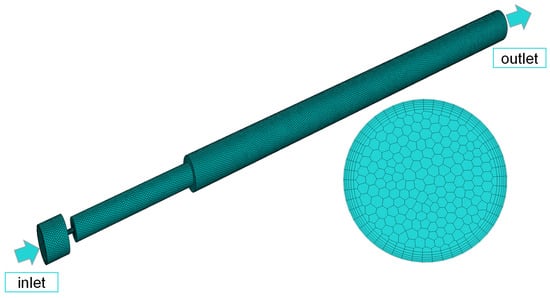 The mesh generation was performed using Fluent Meshing software (Figure 2). A poly-hexcore mesh was employed throughout the domain, with a base element size of 2 mm. Given the significant gradients in pressure, temperature, and velocity near the choke nozzle, local mesh refinement was applied to this region at a refinement ratio of 3:1. Additionally, five boundary layer elements were added to the fluid domain, with the first layer height set to 0.1 mm and a growth rate of 1.1, ensuring a y+ value range of approximately 30.