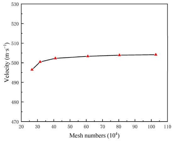 In order to ensure the accuracy of the calculation results, the maximum calculated flow rate in the throttle valve was used as the cell independence verification index, and six cells with different densities were divided. The numbers of cells were 265,980, 315,988, 409,602, 609,240, 803,789, and 1,027,454. The inlet pressure was 100 MPa, the outlet pressure was 30 MPa, the particle mass flow rate was 1 × 10−3 kg/s, the particle inlet velocity was 2 m/s, and the particle size was 50 μm. The maximum flow velocity in the throttle valve under 6 cells was calculated, as shown in Figure 3. When the number of cells was 609,240, the flow velocity was 503.641, and the relative error of the maximum flow velocity in the throttle valve was less than 0.01% when the numbers of cells were 803,789 and 1,027,454. It can be considered that the number of cells had no effect on the calculation results. In order to ensure the calculation accuracy and calculation efficiency, a cell number of 609,240 was finally selected for subsequent calculations.