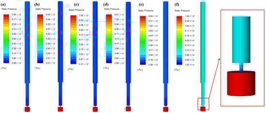 Pressure cloud diagram of throttle valve area. (a) 50 MPa; (b) 60 MPa; (c) 70 MPa; (d) 80 MPa; (e) 90 MPa; (f) 100 MPa.