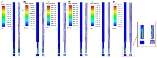 Velocity and trace cloud map of the internal region of the throttle valve. (a) 50 MPa; (b) 60 MPa; (c) 70 MPa; (d) 80 MPa; (e) 90 MPa; (f) 100 MPa.