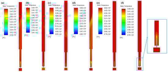 Temperature cloud diagram of internal area of throttle valve. (a) 50 MPa; (b) 60 MPa; (c) 70 MPa; (d) 80 MPa; (e) 90 MPa; (f) 100 MPa.