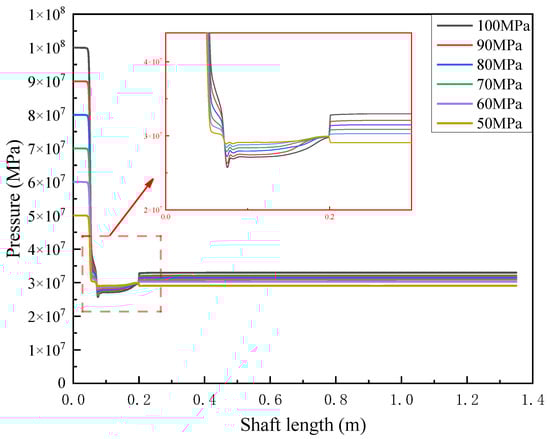 In order to clarify the characteristics of pressure, temperature, and velocity changes, the pressure, temperature, and velocity changes on the central axis of the model were extracted, as shown in Figure 7, Figure 8 and Figure 9, respectively. After the high-pressure tight gas enters the throttle nozzle, the high pressure instantaneously drops to the lowest pressure and then stabilizes in the throttle working cylinder and the wellbore outlet. The higher the inlet pressure, the greater the throttling pressure drop in the throttle valve, and the higher the stable pressure. The pressure range after the 50 MPa–100 MPa inlet pressure throttling is 29.59 MPa to 32.07 MPa.