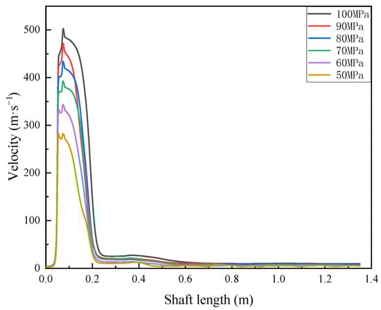 It can be seen from Figure 9 that the inlet flow rate of the tight gas is 2–4 m/s, and the gas flow rate rises rapidly in the throttling nozzle to reach the highest flow rate. The flow rate decreases in the throttling working cylinder, but the flow rate after entering the wellbore is still higher than the inlet velocity of the wellbore. The gas flow rate in the wellbore easily causes erosion of the wellbore. The higher the inlet pressure, the higher the flow rate in the throttling nozzle and the wellbore.