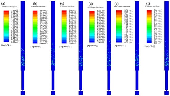Shaft erosion cloud diagram under different pressure inlets. (a) 50 MPa; (b) 60 MPa; (c) 70 MPa; (d) 80 MPa; (e) 90 MPa; (f) 100 MPa.