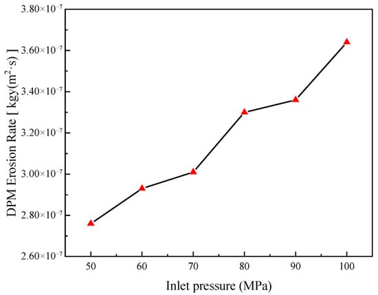 The maximum erosion rate nephogram of the wellbore outlet section was simulated under the conditions of a particle mass flow rate of 1 × 10−3 kg/s, particle size of 50 μm, and inlet pressures of 50 MPa, 60 MPa, 70 MPa, 80 MPa, 90 MPa, and 100 MPa (Figure 10). It can be seen that the erosion shape of the wellbore outlet wall has a point-like distribution. The closer to the throttle valve outlet, the more intense the erosion point distribution is. The maximum wellbore erosion rate under different inlet pressures was extracted (Figure 11). As the inlet pressure increases, the maximum erosion rate increases rapidly. When the inlet pressure increases from 50 MPa to 100 MPa, the maximum erosion rate increases from 2.76 × 10−7 [kg/(m2 s)] to 3.64 × 10−7 [kg/(m2 s)], an increase of 31.88%. This is because the main source of particle kinetic energy is the conversion of gas pressure energy. After the greater inlet pressure throttling pressure drop, the gas in the wellbore carries the particle at a higher speed, and the wellbore erosion is more serious.