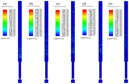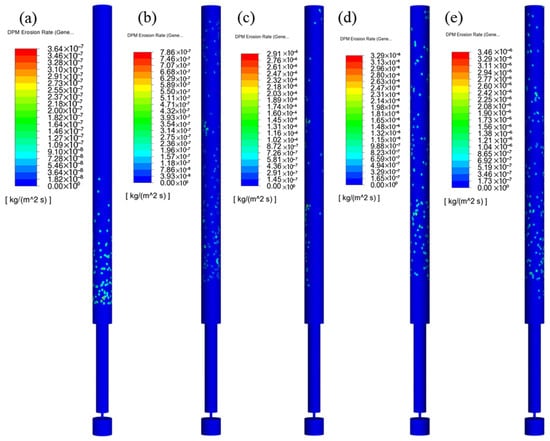 Shaft erosion cloud diagram under different particle mass flow. (a) 1 × 10−3 kg/s; (b) 2 × 10−3 kg/s; (c) 3 × 10−3 kg/s; (d) 4 × 10−3 kg/s; (e) 5 × 10−3 kg/s.